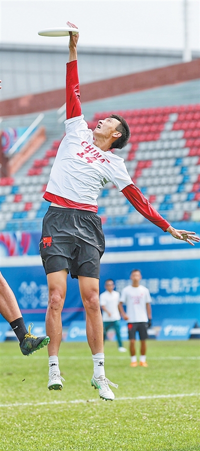 中國(guó)隊(duì)運(yùn)動(dòng)員在團(tuán)隊(duì)飛盤比賽中。