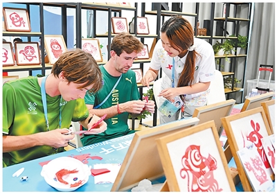 運動員在世運村非遺互動體驗活動區(qū)學習剪紙。