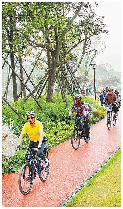 四川省成都市郫都區(qū),市民在沱江河綠道騎行。
