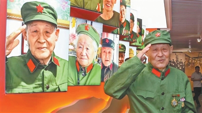 一面照片墻,從右看去,一張張黑白照片,是一位位參加抗美援朝的戰(zhàn)士英姿;自左望來,則是一幅幅彩色相片,是他們敬禮的英雄形象。