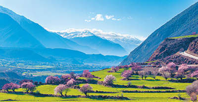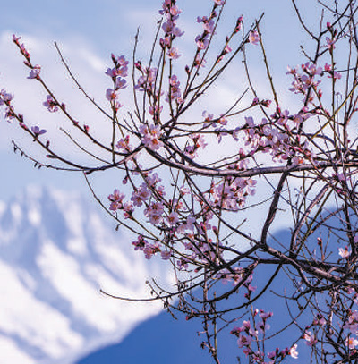 盛開的桃花與遠(yuǎn)處的雪山相映成景。