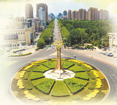 位于包頭市中心的“三鹿騰飛”雕塑,小麗花在雕塑周圍燦爛綻放。