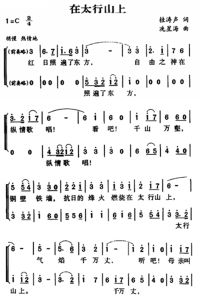 1938年6月下旬,桂濤聲回到武漢,富有鼓動性、戰(zhàn)斗性的抗日歌曲《在太行山上》的歌詞已醞釀成熟。南太行赭紅色絕壁從華北平原拔地而起的雄姿,以及縈繞其間決死抵抗的洶涌民情,通過他滾燙的歌詞,如同狼煙烽火,瞬間點(diǎn)燃了冼星海的澎湃激情。武昌曇華林國民政府軍事委員會政治部第三廳駐地,在借來的一架鋼琴上,歌詞插上了音樂的翅膀。“紅日照遍了東方,自由之神在縱情歌唱!看吧!千山萬壑,銅壁鐵墻,抗日的烽火燃燒在太行山上,氣焰千萬丈,聽吧!母親叫兒打東洋,妻子送郎上戰(zhàn)場。我們在太行山上,我們在太行山上,山高林又密,兵強(qiáng)馬又壯。敵人從哪里進(jìn)攻,我們就要他在哪里滅亡!敵人從哪里進(jìn)攻,我們就要他在哪里滅亡!”