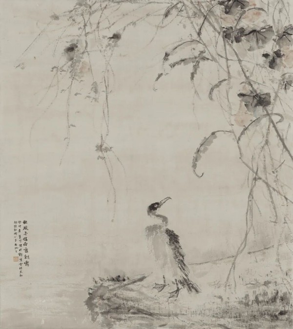 指畫探索是劉萬鳴先生“求意”路上的重要突破。他深入研究了清代高其佩等指畫大家的傳統(tǒng),但并非簡單復(fù)刻,而是追求“指墨雖異,其理一同”。他認(rèn)為“指畫能破筆之樊籠,得筆難至之天趣與古拙。” 以指代筆,線條更顯生辣奇崛,如萬歲枯藤;用掌潑墨,墨色愈發(fā)渾厚華滋,盡顯蒼潤。在此單元,《蕉蔭棲禽》等指畫新作,既保留了指墨特有的“偶發(fā)”與“生澀”,又處處體現(xiàn)其嚴(yán)謹(jǐn)?shù)臉?gòu)圖控制與精微的造型意識,實(shí)現(xiàn)了“拙中寓巧”“亂中見整”的高難度平衡。這一探索,不僅拓展了其花鳥畫的語言邊界,更體現(xiàn)了一位成熟藝術(shù)家在深入傳統(tǒng)堂奧后,勇于打破工具局限、直指藝術(shù)本真——“意”的至高境界。