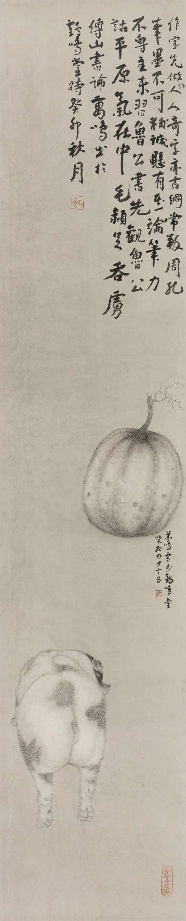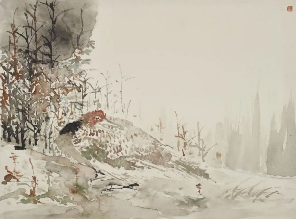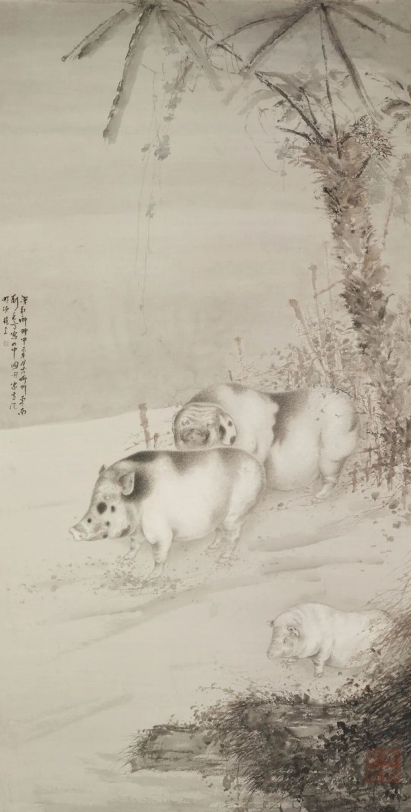 他秉持生活是藝術(shù)的源泉,常年深入鄉(xiāng)村田野,以畫筆反復(fù)推敲自然中一草一木的鮮活氣息。那些憨態(tài)可掬的豬群、靈動矯健的春鳥、靜謐沉思的人物,皆源于對生活的赤誠觀察。在他眼中,萬物皆有靈性,無論是珍禽猛獸還是家禽野草,都能在筆墨中綻放出平等的審美價(jià)值。