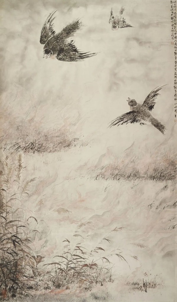而當(dāng)傳統(tǒng)筆墨遇見時(shí)代精神,萬鳴先生的創(chuàng)作更顯其文化擔(dān)當(dāng)與時(shí)代回響。他一方面汲取傳統(tǒng)滋養(yǎng)創(chuàng)作,另一方面又將現(xiàn)代造型圓融地融入其間,實(shí)現(xiàn)“致廣大而盡精微”的創(chuàng)造性融合,在禽鳥飛影與山石垂藤間傳遞著萬物和諧的生態(tài)哲思。