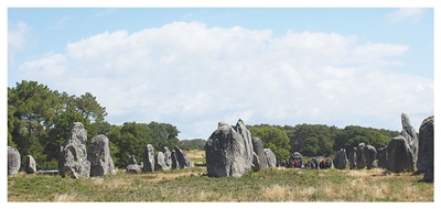 這些巨大的石頭遺跡被冠以“巨石林”“立石”“土丘”等名,展現(xiàn)出遠古人類以石構(gòu)為媒介組織空間、表達信仰的驚人能力。位于卡納克鎮(zhèn)的巨石林(見圖,尚凱元攝)是其中最具代表性的遺址:3000余塊石塊沿地勢高低整齊排列,蜿蜒數(shù)公里。如此宏大、規(guī)則又充滿象征意味的構(gòu)造,引發(fā)人們對史前世界的諸多想象。